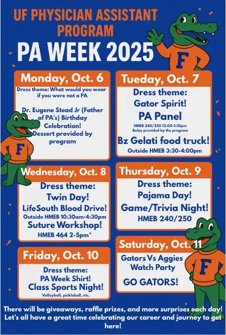 UFPA Class of 2027 PA WEEK: OCT 6-12 Get your AAPA Membership HERESign up for Suture Workshop HERE Important Links EAC Sign-Up Class Feedback Form Submit Volunteer Hours UFPA Interview Volunteer Sign-Up Intramural Sports Sign-Up (FusionPlay) Activities!
